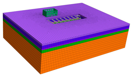 In this study, a three-dimensional model of the foundation pit is established using Midas GTS. In order to reduce the influence of the boundary effect in the horizontal direction, the distance between the model boundary and the edge of the foundation pit is more than three times greater than the depth of the foundation pit and, in the vertical direction, the distance is more than two times greater than the depth of the foundation pit. The dimensions of the established model are 150 m in length, 110 m in width, and 45 m in height. When establishing the model, the soil layer and building foundation adopt 3D solid elements, and 2D plate elements are adopted for the building wall, diaphragm wall and the foundation pit floor. The concrete support, crown beam, steel support and MJS pile are simulated using beam elements. When dividing the model into meshes, in order to ensure the calculation accuracy, the meshes of the foundation pit and building areas were appropriately densified. Figure 6 shows the established numerical model and its mesh division. The number of meshes in the model is 126,325, and the number of nodes is 93,194.