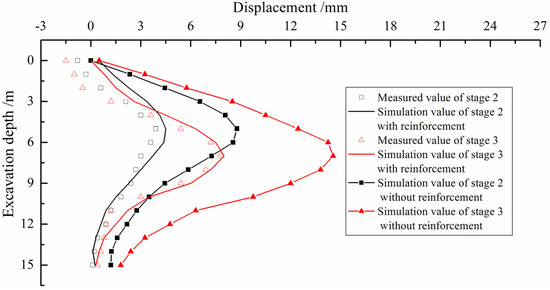 This study focuses on comparing the diaphragm wall deformation at monitoring point B1 during stages 2 and 3. This is because there is a significant difference in the diaphragm wall deformation between these two stages, which is more conducive to comparative analysis. Figure 7 reveals a consistent trend between the simulated values and field-measured data. At an excavation depth greater than 5 m, there is a certain deviation between the simulated value and the measured value, mainly due to the lack of consideration for the timeliness of field support construction during the simulation. By comparing simulated values with measured values, the goodness-of-fit values (R2) of stages 2 and 3 are 0.81 and 0.86, respectively. This indicates that the established numerical model can effectively simulate the excavation process of foundation pits. In addition, the absence of an MJS pile leads to diaphragm wall displacements greater than the measured values. This proves the effectiveness of MJS pile reinforcement in reducing lateral displacement and potential risks during the excavation of foundation pits.