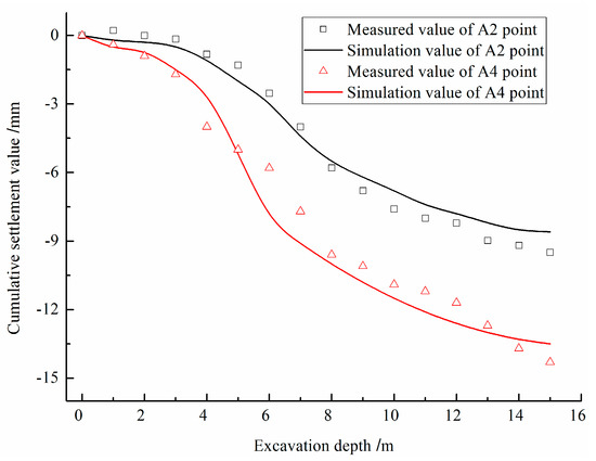 Similarly, the settlement values of two different monitoring points (A2 and A4) positioned on corners of the ancient building were selected for comparison. Figure 8 illustrates the comparison between the measured values and the simulated values.