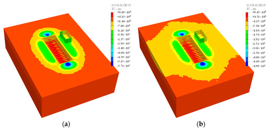 Comparison of ground settlement with and without MJS pile. (a) Without MJS pile; (b) with MJS pile.