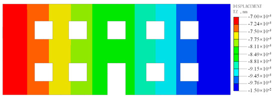 The vertical deformation of the front wall of the ancient building upon completion of foundation pit excavation with an MJS pile is shown in Figure 10. From the figure, it can be seen that the settlement of the building wall ranges from 7 to 15 mm. Moreover, the closer it is to the middle of the foundation pit, the greater the settlement of the wall, resulting in an incline of the wall towards the middle of the foundation pit.