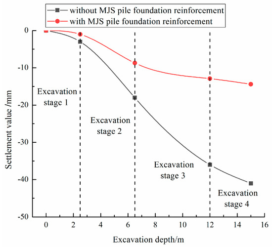 The maximum settlement of the ancient building’s wall with and without the presence of an MJS pile during different construction stages is shown in Figure 11. It can be seen that as construction progresses through stages 1 to 4, the settlement of the wall gradually increases with an increase in excavation depth. Compared with not using an MJS pile, the settlement curve of the building’s walls with MJS pile reinforcement is relatively flat. In addition, the maximum settlement value of the building’s wall without MJS pile reinforcement reached 45 mm, which is approximately 3.6 times that of the building’s wall with MJS pile reinforcement. This indicates that the use of an MJS pile played a good protective role for ancient buildings.