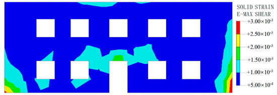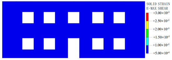 Relevant research shows that the failure of buildings is usually caused by shear strain induced by uneven settlement of their structure [22]. Therefore, this paper uses the maximum shear strain as an indicator to evaluate the damage degree of the studied building, as shown in Table 4. The shear strain of the front wall of the building with and without MJS pile reinforcement is shown in Figure 12 and Figure 13. Using MJS pile reinforcement, the shear strain of the wall is less than 0.05%, and the degree of damage can be ignored. When there is no MJS pile reinforcement, the shear strain of the wall at the doors and windows is 0.1% to 0.15%, constituting a slight degree of damage, while the shear strain range at the corners is 0.15% to 0.3%, indicating a moderate degree of damage. This is mainly due to the stress concentration caused by the uneven settlement of the building in these areas, which can easily lead to cracks and damage in the doors, windows, and corners of the building. Through comparison, it can be seen that upon using an MJS pile, the impact of foundation pit excavation on the building’s walls is significantly reduced.
