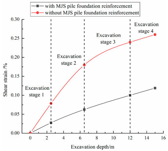 The maximum shear strain of the ancient building’s wall with and without MJS pile reinforcement during different construction stages is shown in Figure 14. It can be seen that as construction progresses through stages 1 to 4, the maximum shear strain of the wall gradually increases with increasing excavation depth. The increasing trend of shear strain without MJS pile reinforcement is more significant, with a maximum value of 0.26%, which is about three times the maximum shear strain when using MJS pile reinforcement.