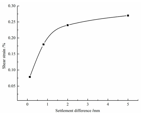 From the previous analysis, it can be seen that foundation pit excavation influences the settlement of adjacent buildings. Therefore, the impact of excavation on the degree of damage to adjacent buildings can be evaluated by analyzing the relationship between the buildings’ settlement difference and the wall strain. Figure 15 depicts the relationship curve between the settlement difference and wall shear strain of the building under study. As the settlement difference increases, the maximum shear strain of the wall gradually increases, and the relationship resembles a logarithmic function. Due to the different distances between different parts of the building and the foundation pit, the less affected wall exerts a pulling effect on the wall closer to foundation pit, which causes shear force on the wall, resulting in shear strain.