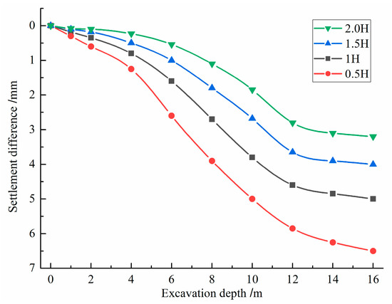The influence of MJS pile depth on the settlement difference of the ancient building under investigation is shown in Figure 16. As the depth of the MJS pile increases, the settlement difference of the ancient building gradually decreases. The impact of MJS pile reinforcement is primarily observed within the excavation depth range of 4 m to 12 m. However, when the length of the MJS pile exceeds 1.0 times that of H (where H represents the depth of the foundation pit), the impact of MJS pile depth on the building’s settlement difference is reduced. Therefore, the shear strain of the wall related to settlement differences is also reduced. From the perspectives of cost-effectiveness and practicality, the length of the MJS pile should be taken as one times the depth of the foundation pit.