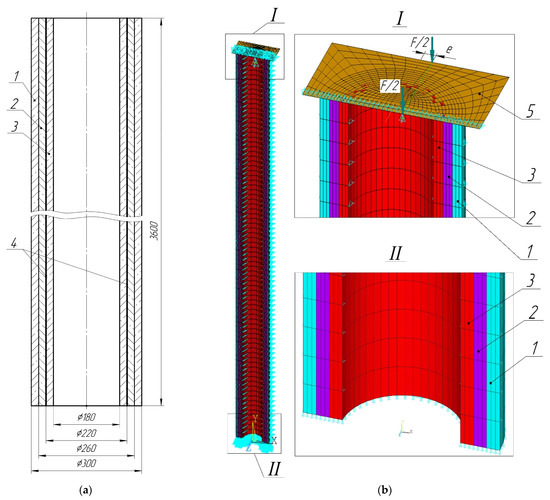 Column scheme (a) and FEM model (b): 1, 2, 3—concrete layers; 4—reinforcing bars; 5—rigid plate for load transfer with eccentricity. The boundary conditions marked in blue. Other colors correspond to elements with material properties, according to Table 1.