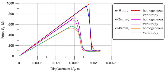 The variotropic structure has a stronger outer layer, therefore, in the case of an eccentric load application, the situation changes radically, and the best strength results in this case are shown by the variotropic column design (purple and green graphs), which can be explained by the influence of higher strength characteristics in buckling.
