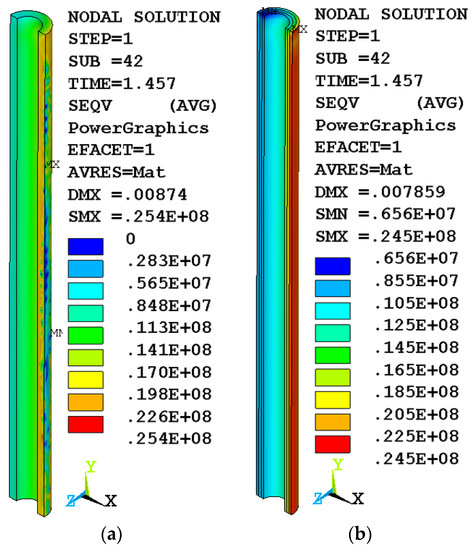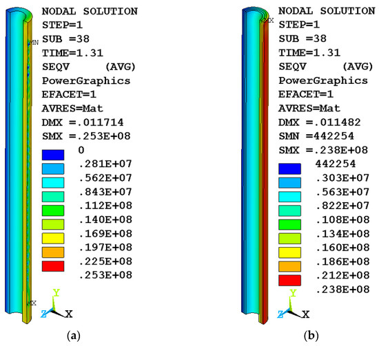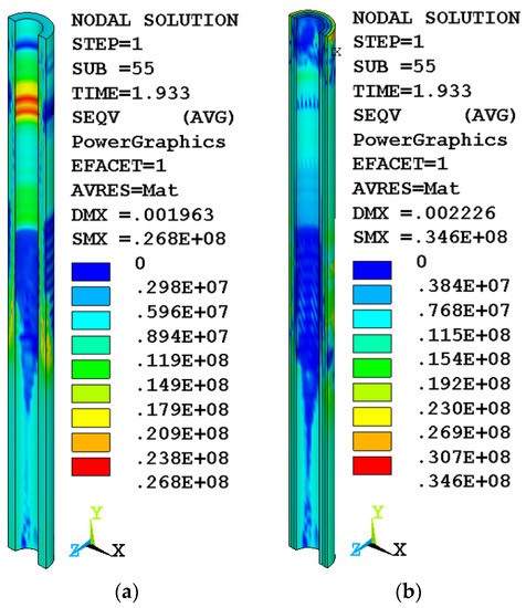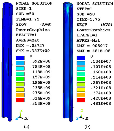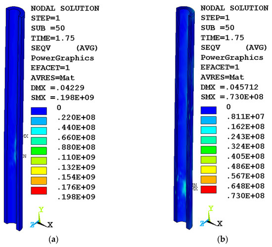 As a result, the stress in the destroyed elements is close to zero, which can be seen in the inner layer of concrete of the variotropic column (Figure 3b). The homogeneous column continues to support the load. Some similarity of stress distribution can be observed between the body of a homogeneous column (Figure 3a) and two layers (outer and middle) of a variotropic one (Figure 3b), where the inner layer was turned off due to its destruction.