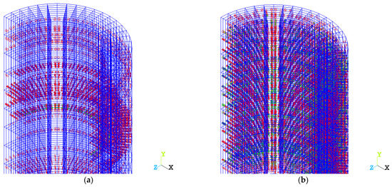 Analyzing Figure 8 and taking into account the results presented above, it becomes obvious that at the loading step 42 (with a displacement of the load application points by 1.46 mm), a homogeneous column resists with a force of 686 kN (Figure 8a), and a variotropic one with a force of 710 kN (Figure 8b). At the same time, the blue zone (blue spots) of stress fields on the surface of a homogeneous column (Figure 8a) indicates that the concrete sections in this area have already collapsed, and, consequently, the stresses in these sections have dropped to almost zero. Only the part of the concrete that survived at this stage, located closer to the center of the column, resists. Therefore, the stresses there are not equal to zero, but somewhere they reach the maximum values for this stage (in the range of 22.6–25.4 kPa). Figure 8b shows that the outer surface of the column is loaded to a value in the range from 22.5 to 24.5 MPa. This indicates that the material here still holds the load and has not collapsed. Thus, in the process of destruction, there is a constant redistribution of stresses along the sections of the columns, accompanied by an increase in these stresses in the surviving parts of the sections. Similar patterns can be seen in Figure 12.