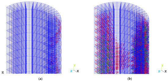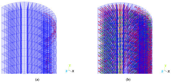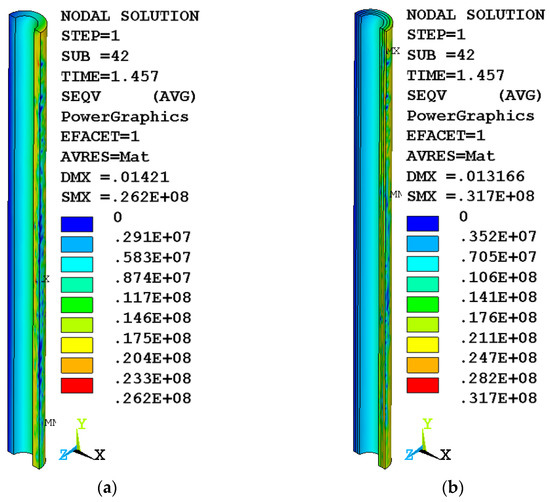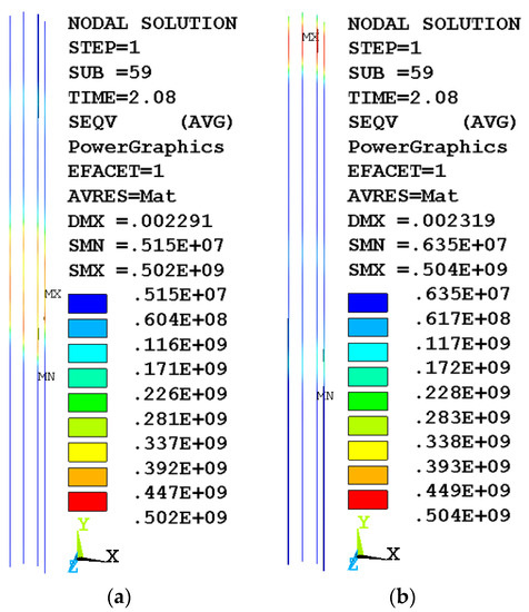 The results of solving the problem for a homogeneous concrete structure of a column under central compression (Figure 3a) and a variotropic column (Figure 3b) in the form of equivalent von Mises stress fields show the stress–strain state of the column and the zone of the beginning of destruction (shown in red). It can be seen that the onset of fracture occurs in the upper part of the column, which is due to the influence of the boundary conditions during loading.