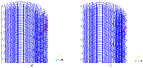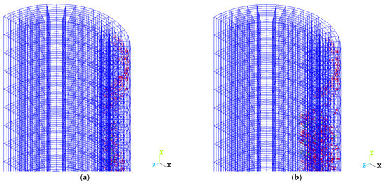 The destruction of a variotropic column begins earlier than a homogeneous one (Figure 3). This can be explained by the fact that when the critical level of stresses in the body of a homogeneous column is reached, the process of its destruction begins with an avalanche-like increase in the loss of the whole (underupted) section. This critical stress background reaches its value immediately over the entire section of the column. In the case of a variotropic column on its inner part, these stresses reach their critical value somewhat earlier than in a homogeneous one (with less displacement, since the strength of the inner layer is less than that of the middle and outer). Consequently, the column begins to collapse precisely here, which leads to a sharp reduction in the area of the remaining surviving section and a faster increase in stresses in it. This is clearly seen in Figure 3 and Figure 5. Moreover, Figure 3 shows the results of loading at step 52, when the intensive process of destruction of the variotropic column begins (Figure 3b), while in the homogeneous one (Figure 3a), cracks are just beginning to emerge. Cracks are shown in Figure 4a for a homogeneous column and Figure 4b for a variotropic one. Cracks in concrete are marked with red circles.