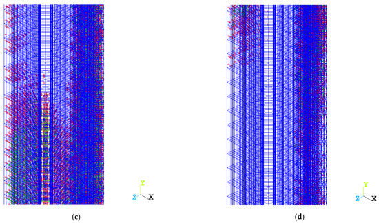 Compression cracking with eccentricity e = 24 mm for (a) a uniform column at the top support; (b) variotropic column at the top support; (c) a uniform column in the middle; (d) variotropic column in the middle part (supercritical fracture zone).