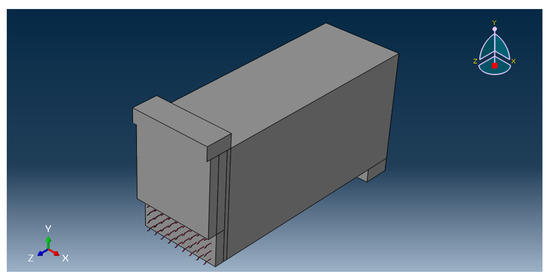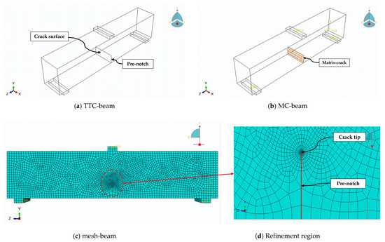 The ABAQUS software package [23] is utilized to simulate through-thickness cracked (TTC) and MC beams. The Concrete Damage Plasticity (CDP) model is employed in these simulations. This model was described in the previous work in additional detail [24,25,26,27,28,29]. The compressive stresses and the related inelastic strain relationships were used to determine concrete’s uniaxial behavior in compression. Tensile stresses and the corresponding cracking opening displacement were used to determine the uniaxial behavior of concrete under tension through a bilinear relation.