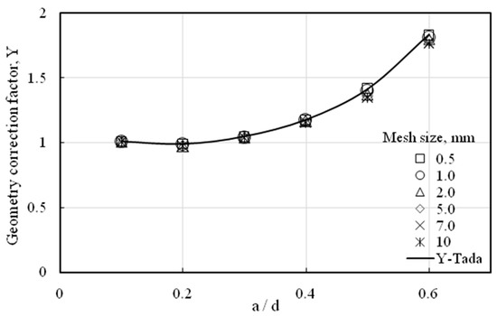 Mesh sensitivity analysis was performed on the model by using different mesh sizes. A sensitivity analysis was conducted to evaluate the effect of mesh resolution variation on the results. The model’s sensitivity to different mesh densities was assessed by changing the mesh size. Mesh sizes of 0.5, 1, 2, 5, 7, and 10 mm were used. Figure 3 shows the relation both between (crack length to depth ratio) different mesh sizes and their geometry correction factors.