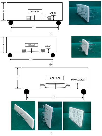 The third category consists of three patterns of MC-FRC beams, with fibers with a Vf% equal to 1 and 2% distributed on the fabricated MC surface and the entire beam. This category aims to verify the fracture toughness calculations for this experimental program and other previous studies of Sallam and co-workers [17,18,19,20,21]. The experimental program is described in detail in Table 6.
