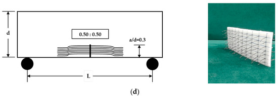 The second category comprises seven TTC-HSC and MC-HSC beam patterns. The MC-HSC beams were made from HSC, stitching the pre-crack surfaces with steel fiber, as shown in Figure 5. The MC-HSC pattern beams have three different initial crack-to-depth ratios (a/d) equal to 0.1, 0.3, and 0.5 and two Vf% equal to 1 and 2%, distributed only on the fabricated MC surface. The distributed fibers have different fixation lengths according to their position on the MC; one-third (T), a quarter (Q), and middle (M), as shown in Figure 5. This category is the primary basis of this study. It concerns indicating the effect of fibers’ presence on the crack surface on the enhancement of the fracture properties of the beams.