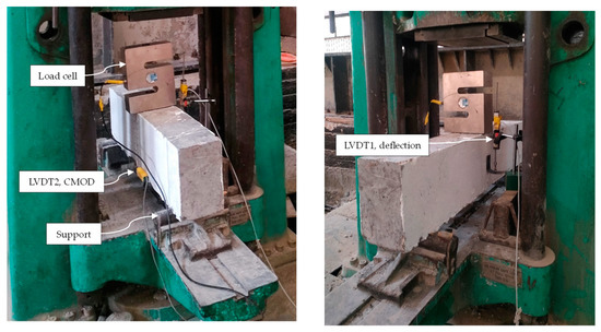 All beams have a constant rectangular cross-section and span length of 150 × 200 × 1000 mm3 with a clear span of 800 mm and a constant span-to-depth ratio (L/d) equal to four. A three-point bending test was applied to all patterns of beams by a universal machine with a capacity of 1000 kN. A load cell with a maximum capacity of 300 kN was used to measure the applied flexural load of the beams. The experiment employed two linear variable differential transformers (LVDTs) with a precision of 0.001. LVDT1 was utilized to measure the deflection at the mid-span of all beams while LVDT2 was employed to measure the CMOD for cracked beams, as shown in Figure 6. All data were acquired using a data acquisition system and collected in a computerized manner.