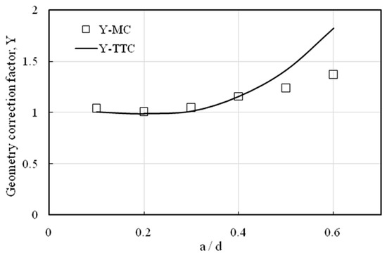 SIF was calculated by Equation (3). After obtaining the values of SIF for different beams, the relation between the SIF and stress is used to calculate the geometry correction factor; these values are compared with Tada et al. [31].