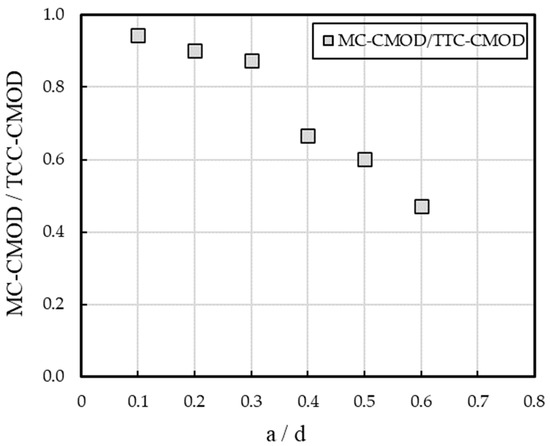Figure 8 shows a comparison between the crack mouth opening displacement CMOD for an MC and TTC at different ratios of a/d by dividing the values of CMOD of MC over the corresponding values of CMOD of TTC. By increasing the a/d ratio, the influence of the MC approach becomes more effective, whereas, a/d equals 0.6 and gives the smallest ratio, as seen in the figure, which confirms that the TTC approach was not reliable in evaluating the realistic fracture toughness if compared with an MC approach which was reliable in obtaining the real fracture toughness because it takes the significant effect of fiber bridging into account. It is clear that CMOD is more sensitive to the presence of fibers across the crack surfaces than the geometry correction factor Y.