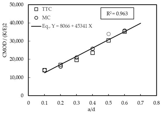 The numerical value was used in the previous equation for TTC and MC bridging beams at different crack lengths to estimate the equation shown in Figure 9. Equation (9) is used to predict the fracture toughness (KIC) by measuring the critical value of CMOD (CMODC) as follows: