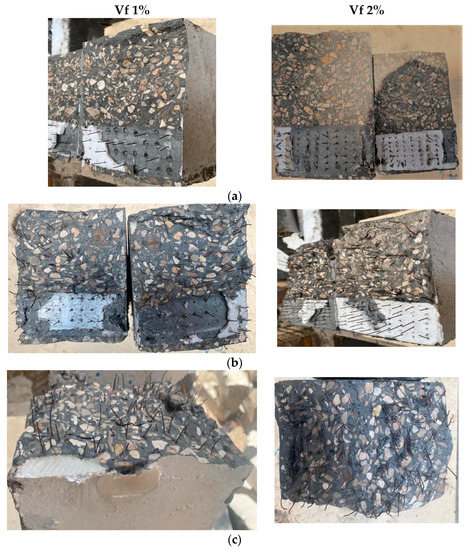 Figure 11 shows the fracture surface of the following beams: (a) fibers only in the crack surface, (b) fibers entirely in the cracked beam, and (c) fibers entirely on the smooth beam for both Vf% of 1% and 2%. The distribution of hooked-end steel fibers on the fracture surface of beams appears to be satisfactory. This is clear in the uncracked beams, as shown in Figure 11c. Fiber pullout is observed at the fracture surfaces of the beams. The failure observed in this area is classified as a trans-granular fracture due to the excellent bond between the coarse aggregates and mortar at the interface. As a result, there is no contribution from coarse-aggregate bridging or crack deviation to dissipate the energy in these beams effectively.