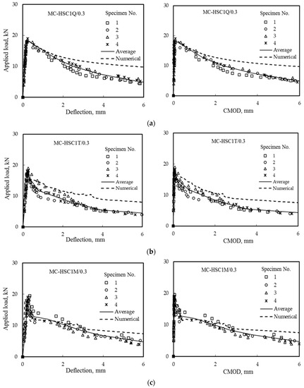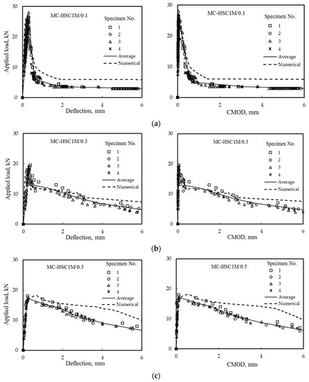 Load–deflection and load–CMOD curves for HSC beams with three different ratios of a/d, 0.1, 0.3, and 0.5 are shown in Figure 14. A comparison between numerical and experimental results was conducted and listed in Table 7. It is clear from Table 7 that the coefficient of variation percentage (CoV%) of the second and third sets are lower than 5% while the first set is lower than 10%, indicating suitable method performance [40,41]. Generally, CoV% < 10 is considered very good, 10–20 is good, 20–30 is acceptable, and CV > 30 is unacceptable. The higher value of CoV% of the first set than those of the second and third sets may be attributed to the small length of the pre-notch-to-beam depth ratio (a/d = 0.1). Therefore, most of the specifications recommended a/d ranged from 0.3 to 0.5 [41]. On the other hand, the error %, i.e., the difference between the predicted values obtained numerically and those measured experimentally of the first and second sets is lower than 2% while the third set is lower than 7%. The higher error % of the third set may be attributed to the higher numbers of fibers simulated as a/d is the higher value, i.e., =0.5.