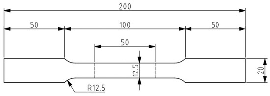 The tensile samples were designed following ISO 6892-1 [32], method A (Figure 2). Tensile testing was conducted at room temperature using a 3R testing machine (SYNTECH 150) with a maximum load capacity of 150 kN. A dynamic extensometer gauge, Catalog 2620-601, was utilized for direct static measurement of deformation. The extensometer features a 12.5 mm gauge length with a travel range of ±5 mm, allowing for ±40% strain. Tensile tests were performed at a strain rate of 0.025% per second.