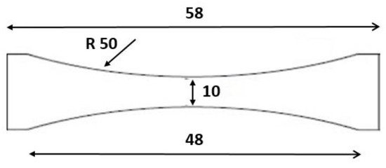 The numerical fatigue analysis was conducted using Abaqus/FEA coupled with fe-safe, a powerful fatigue analysis software from SIMULIA for finite element models. A two-dimensional model in Abaqus/Standard 2019 finite element code was used to simulate the uniaxial fatigue test. The dimensions of the experimental samples (Figure 3) were incorporated into the finite element model. Linear quadrilateral elements of type CPE4R were employed to mesh the model geometry, resulting in a total of 7800 elements. The central region of the model was assigned finer elements. One boundary of the model was fixed, while a load was applied to the opposite boundary. The material properties assumed in the analysis were isotropic elasticity with a Young’s modulus of 113 GPa, a Poisson’s ratio of 0.3, and a yield strength of 800 MPa. A load of 24 kN was applied to the model. The material parameters were determined from monotonic tensile tests. Once the Finite Element Analysis (FEA) solutions were obtained, the output file (*.odb) from Abaqus was imported into fe-safe software for fatigue analysis. The fe-safe elastic block method was selected for this analysis. The uniaxial stress–life algorithm was used to calculate the S–N curve, defined by the Basquin relationship [34]: