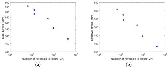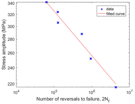 where σa is the stress amplitude; and are the maximum and the minimum stress, respectively; 2Nf is the number of reversals (half-cycles) to failure; the fatigue strength coefficient, σ′f, represents the intercept at 2Nf = 1 reversal; and b is the fatigue strength exponent (Basquin’s exponent).