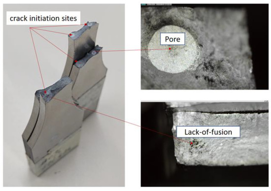 The high fatigue performance of the tested samples can also be attributed to the low internal porosity rate present in the samples [6,10,16,18,20,21,22,26,42,44,45,46,47,48,49]. Analysis of the X-ray CT scans measuring the porosity revealed a low porosity in the samples, with pore sizes ranging from 12 to 66 µm and having a mean size of 23.6 µm. The average area fraction of porosity was approximately 0.003%, indicating a high density of the samples. This high density is achieved through the deposition method used, which involves overlapping up to 40% of the deposited layer tracks. However, it is important to note that the samples cannot be considered completely free of pores, as some porosity and lack of fusion were observed at the fracture surfaces. Figure 6 illustrates a typical example of crack initiation sites observed on the post-mortem samples, with internal porosity being the predominant defect leading to crack initiation in most samples.