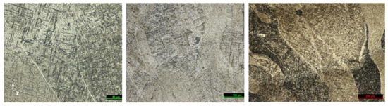 The microstructure of the tested samples was analyzed, as shown in Figure 7. The micrographs revealed a typical morphology of the Additive Manufacturing Directed Energy Deposition (AM DED) process [5,47]. The microstructure consisted of a two-phase lamellar structure composed of colonies of α-strips with different orientations (white) separated by the β-phase (black). Primary β grains formed long columns, and α and α’ needle phases were observed within the β grains. The microstructure appeared relatively homogeneous throughout the entire construction, although the size of the lamellae varied depending on the specific area (bottom or top) of the sample.