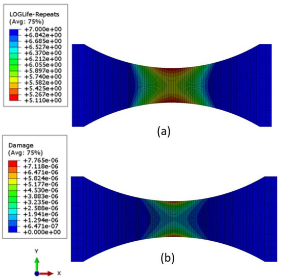 The results of the numerical simulations. In (a), the logarithm of fatigue lives of the model is displayed for a stress amplitude of 306 MPa. The color-coded values represent the variation in fatigue life throughout the model, with elements corresponding to the worst-case life shown in red. (b) presents the contour plots of damage distributions, indicating the critical locations where fatigue failure is likely to occur, shown in red.