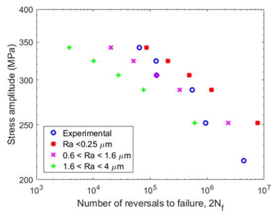 Comparative analysis of numerical and experimental S–N curves for different surface roughnesses in DED Ti–6Al–4V alloy at a UTS value of 1044 MPa. The surface roughness of the experimental samples ranged from 0.27 to 2 μm in terms of the average roughness, Ra.