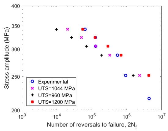 Numerical S–N curves for various values of UTS in comparison with the experimental S–N curve. The numerical simulations were conducted with a surface roughness range of 0.6 < Ra < 1.6 µm.