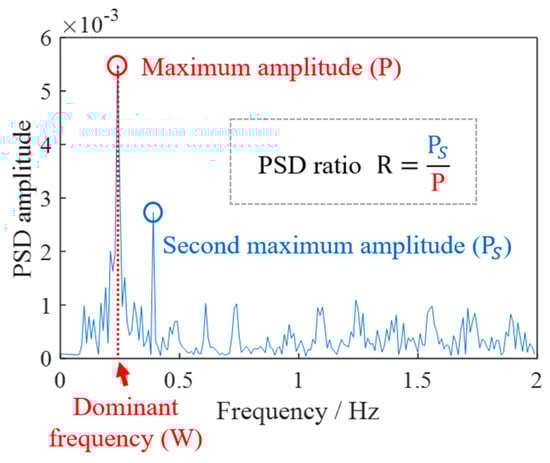 To capture the distinct spectral characteristics of VIV and buffeting vibration, the following two frequency domain characteristics are primarily extracted: the main frequency PSD amplitude P and the energy concentration coefficient R. Figure 2 provides a visual representation of P and R, wherein the energy concentration coefficient R is the ratio of the main frequency PSD amplitude P to the second main frequency PSD amplitude. Furthermore, VIV exhibits a phenomenon known as frequency locking, whereby the bridge’s significant vibration influences the shedding frequency of the vortex. As a result, changes in wind speed within a certain range do not alter the frequency of the bridge’s VIV. This section introduces a novel characteristic index, namely the main frequency change value . It is computed by dividing the ten-minute acceleration data segment into two five-minute segments and calculating the difference between the main frequency of the first five minutes of data and the main frequency of the last five minutes of data.