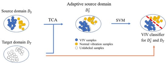 This section presents an adaptive method for identifying VIV in the main girders of long-span suspension bridges based on TCA. The proposed method is applicable to identifying VIV data in different long-span bridges without the need for historical data. AIA-VIV can be applied directly to the target bridge monitoring dataset or historical extensive monitoring data for identifying vortex-excited vibrations. Figure 3 illustrates a schematic diagram of the AIA-VIV algorithm, comprising three main components. The first part involves dataset acquisition and feature extraction. The target bridge dataset is utilized as the target domain data, which do not include labels, while the source domain data comprise labeled vibration data from other bridge datasets. The second part pertains to transfer learning, where various unsupervised transfer learning methods discussed in Section 2.1 are employed to align feature samples across domains. The target domain remains unchanged, while the source domain becomes an adapted source domain. The third part focuses on the classifier. The trained SVM classifier can perform real-time recognition of vortex-induced vibrations in target bridges and also identify VIV data in large historical datasets.