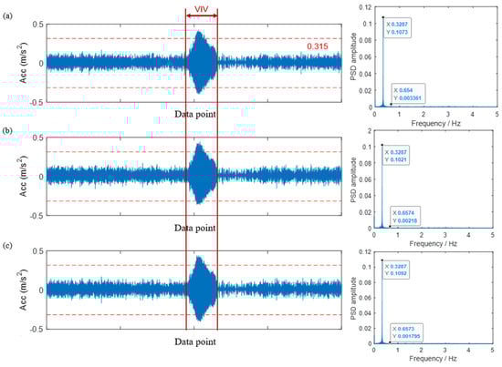 The PSD diagram in Figure 5 reveals that the two main frequencies associated with the abnormal vibrations, 0.2437 Hz and 0.2435 Hz, are extremely close. Moreover, the vibration magnitude of the second main frequency is insignificant compared to that of the first main frequency, which is aligned with the characteristics of self-excited vibrations. Furthermore, the occurrence of sudden amplitude increases on multiple occasions corroborates the conclusion that the abnormal vibration event is induced by VIV.