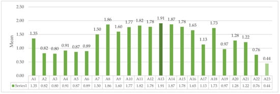 | A13 Natural ventilation | 36 | 11.0% | 84 | 25.6% | 83 | 25.3% | 125 | 38.1% | 1.91 | 63.5 | 1 | 1.04 |