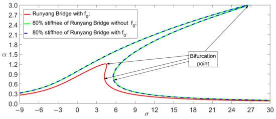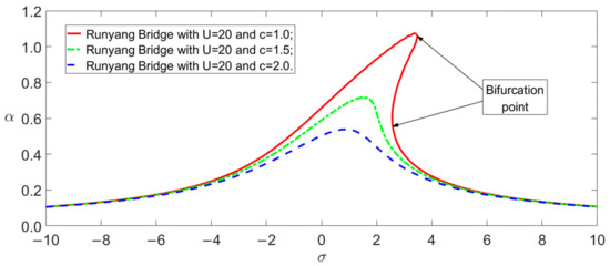 Equation (11) is a nonlinear equation with a constant term. A similar equation was also obtained in electrostatic microresonators [28]. Since the structure of suspension bridges is complex, it is not easy to accurately obtain their structural damping. Existing studies have shown that the modal damping ratio of suspension bridges is to for low-frequency vibrations [11,29,30,31]. In this paper, we took for the Runyang Bridge in China. For simplicity, we rescaled Equation (11) using , , and , so