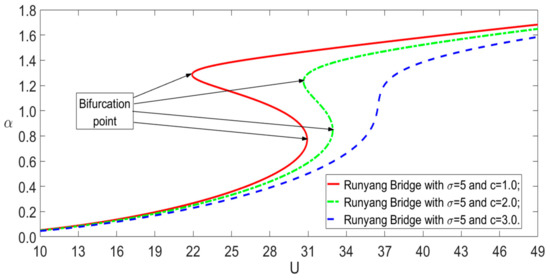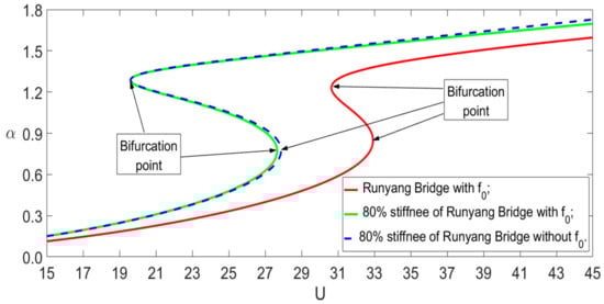 In this section, we used the Runyang Bridge to demonstrate the influence of wind loads and structural parameters on the nonlinear vortex-induced vibrations. Here, we also compared the Runyang Bridge’s vibrations with another bridge using the Runyang Bridge’s geometrical dimension, but only its eighty-percent mass, bending stiffness, and tensile stiffness. The Runyang Bridge is a typical long-span suspension bridge, and it has been widely studied [33,34]. Its structural and geometrical parameters come from Ref. [33], as shown in Table 1. According to Equations (8) and (12), the parameters in Equation (13) can be obtained, as shown in Table 2. One can find from Table 2 that the linear and nonlinear coefficients in the dimensionless mathematical model of the two bridges are identical if their stiffness and mass are proportional. Nevertheless, their loads are inversely proportional. In the present research, the dimensionless load of the small stiffness model increase by times. Using the data in Table 2 and Equation (28), the relationships between the vibration amplitudes and the other parameters were obtained for the two bridges, as shown in Figure 2, Figure 3, Figure 4, Figure 5, Figure 6, Figure 7, Figure 8, Figure 9 and Figure 10.