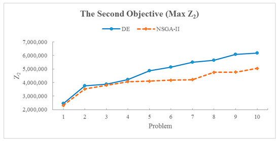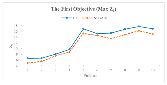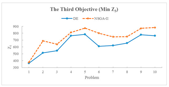 The results of solving the model by algorithms in random sample problems, according to Table 6, show the values of the objective functions of the best solution. As seen in all the cases, the solutions obtained from the multi-objective DE algorithm were better than the solutions obtained from the NSGA-II, which can lead to the desired objective function values. Regarding the mentioned cases and the obtained answers, in the following and Figure 4, Figure 5 and Figure 6, the results have been presented and evaluated in the form of diagrams to obtain an easier discernment of the performance of the solution algorithms and the difference in the current results. It is worth mentioning that according to the explanations of the relations and modeling, the first objective function (Z1) and the second objective function (Z2) were optimal as maximized, and the third objective function (Z3) was optimal as minimized. In this regard, Figure 4, Figure 5 and Figure 6 also indicate the DE algorithm’s more satisfactory performance in the sample problems and the optimal answers obtained from solving the mathematical model of the current research.