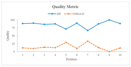 According to Table 7, the investigation results indicate that in all sample problems, the quality and spacing metrics values obtained from the multi-objective DE algorithm were greater and superior to those calculated for the NSGA-II. These results demonstrate the high capability and power of the multi-objective DE algorithm compared to the NSGA-II in reaching an optimal answer, as well as a higher ability to explore and exploit the feasible area of the solution. It is worth noting that the duration of processing and running of the DE algorithm was somewhat longer than the NSGA-II, but there was no significant difference. Also, the obtained values in the field of diversity metric show that the NSGA-II searches the solution area more uniformly than the DE algorithm, and the obtained answers are more uniform. Regarding the mentioned cases, in the following and according to Figure 7, Figure 8 and Figure 9, the relevant graphs are also presented for the purpose of easier examination and a better understanding of the performance of the solution algorithms in the current research based on the evaluation metrics of the multi-objective problems.