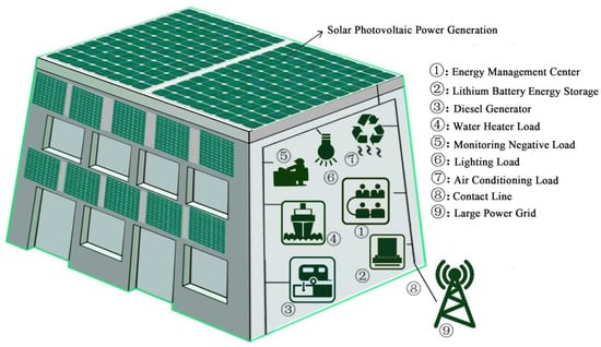 Building-integrated photovoltaic (BIPV) technology is a combination of solar photovoltaic power generation technology and buildings, which can be used as the envelope of the building, and it can also convert sunlight into electricity to supply the building, while the rest of the energy can be transmitted to the city grid [], as shown in Figure 2.