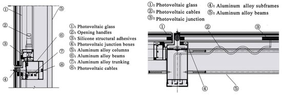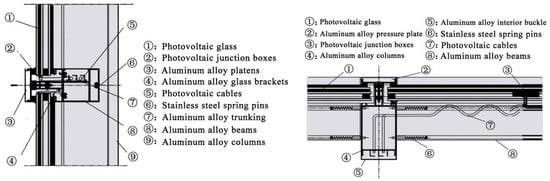 The curtain wall structure used in this exemplary case is a hidden frame PV curtain wall aluminum column structure. As the PV curtain wall structure must be in full contact with the sunlight in order to optimize the photovoltaic conversion effect, the hidden frame PV curtain wall construction method effectively prevents the structural system from blocking the sunlight, thus reducing its impact on the PV conversion effect. At the same time, according to the practical application experience, the hidden frame PV façade has a better heat insulation performance and waterproof effect, and the construction is simple, facilitates fast installation, and can save costs, which is in line with the concept of green energy saving and environmental protection []. Therefore, many of the existing PV curtain wall projects use the hidden frame PV curtain wall structure, as shown in Figure 5.