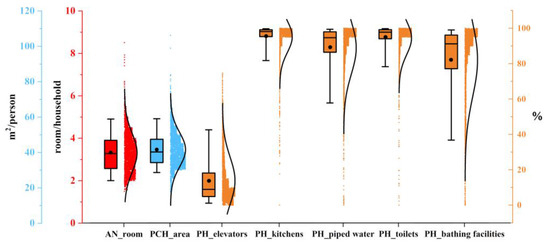 Based on the principles of systematicity, validity, and accessibility of data, the housing conditions of residents in county-level units in China are evaluated comprehensively in three aspects: spaciousness of housing, internal infrastructure, and elevator configuration. Among them, spaciousness is evaluated by the average number of rooms per household and housing floor area per capita, for example, indicators such as the floor area per capita, number of bedrooms, and number of occupants have been used to assess housing conditions in prior studies, e.g., [10,23]. Internal infrastructure is mainly reflected by the configuration of piped running water, as well as kitchen, toilet, and bathing facilities. Indicators such as finishing materials, water and electricity supply, and household toilet facilities were used to evaluate housing conditions in Nigeria in past studies, e.g., [21,22]. The configuration of elevators is based on the ratio of the number of households with elevators in the building where the housing is located. The elevator configuration is an important aspect of housing convenience; housing with elevators is more convenient for residents to go up and down, wherein housing conditions are better (Table 1 and Figure 3).
