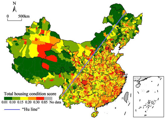 China has a unique urban housing market [5], and its housing problem has been the focus of attention in all sectors of society. The population of cities is increasing rapidly as urbanization continues to advance rapidly, generating a series of housing problems for the low- and middle-income classes and the mobile population [34,35,36], and conducting research on urban housing conditions in response to the current housing problems in China is necessary. Studies of housing conditions in China have mainly focused on housing conditions and health [5,24,37], housing conditions and satisfaction [10,38], housing conditions and the mobile population [39,40], and housing condition evaluation [41]. However, there is a lack of research on the spatial patterns of housing conditions in China at the county level, which is crucial for understanding and improving housing conditions.
