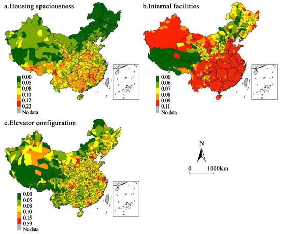 The pattern of the spatial differences in housing conditions (spaciousness, internal infrastructure, elevator configuration) of the different subtypes was further analyzed (Figure 4), and the way the housing conditions of different classes of subtypes were divided is shown in the legend of Figure 5. A significant difference exists in the pattern of housing conditions of different subtypes. In terms of the spaciousness of housing (Figure 5a), it shows a difference pattern of high in the south and low in the north. In terms of internal facilities (Figure 5b), the scores of housing internal facilities in Northeast China, Inner Mongolia, Shanxi, and the Qinghai–Tibet Plateau are relatively low, while the rest of the regions have high scores. In terms of elevator configuration (Figure 5c), the elevator configuration scores in urban areas are generally higher than those in non-urban areas, showing a difference between urban and non-urban areas.