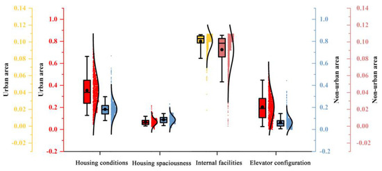 As shown in Figure 7, the housing condition scores, internal facilities scores, and elevator configuration scores are generally higher in urban areas than in non-urban areas, with a relatively dispersed data distribution. Furthermore, the housing spaciousness in urban areas is lower than in non-urban areas, with a relatively concentrated data distribution.