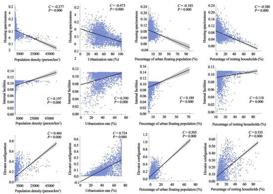 A significant correlation exists between housing conditions and county fundamentals at the urban level. Housing spaciousness and county fundamentals are significantly negatively correlated, with the strongest correlation between housing spaciousness and urbanization, with a correlation coefficient of 0.670, indicating that urbanization has the greatest effect on housing spaciousness, and the higher urbanization has a relatively narrow housing size. Internal infrastructure and elevator configuration are positively correlated with county fundamentals, with urbanization having the most significant effect on housing internal infrastructure and elevator configuration. Thus, this shows that the urbanization rate has a greater impact on housing conditions in urban areas. On the one hand, the urbanization rate has a negative impact on housing spaciousness. On the other hand, the urbanization rate has a positive effect on housing internal infrastructure and elevator configuration.